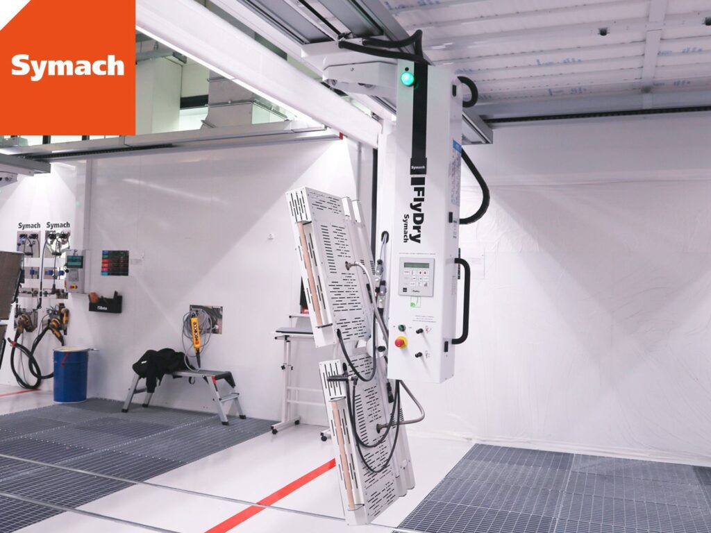 The FlyDry is a robot capable of drying every part of the vehicle; it is usually installed to dry body fillers, primers, waterborne, and clear coats.