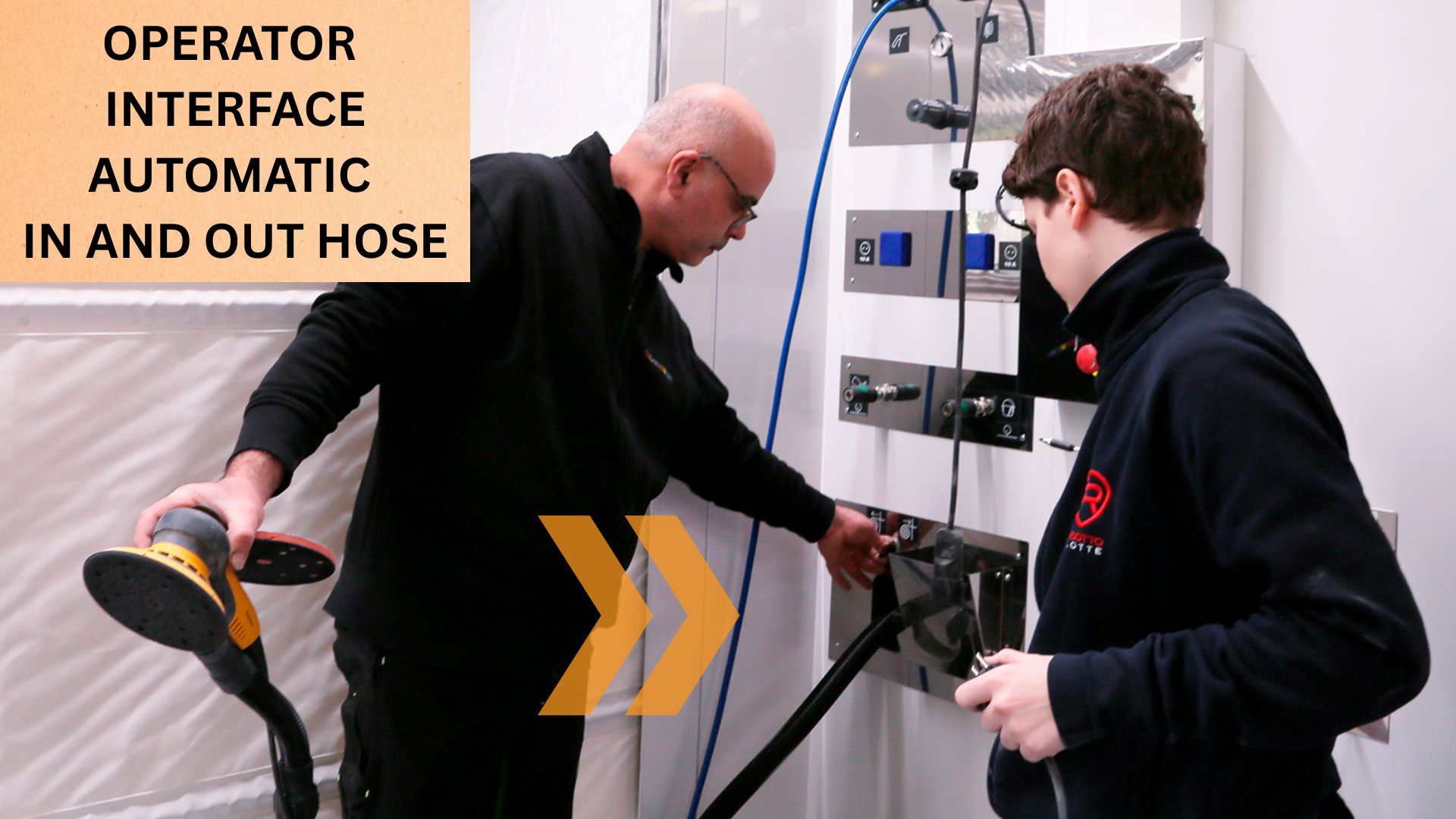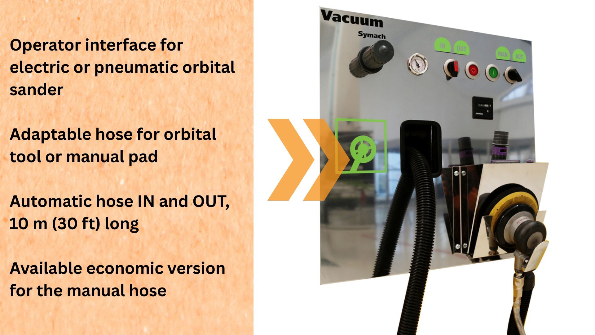 The system allows the operator to choose between automatic and manual suction modes. In automatic mode, the suction is used when using the orbital sander, while in manual mode, it is used when using the hand pad for sanding.