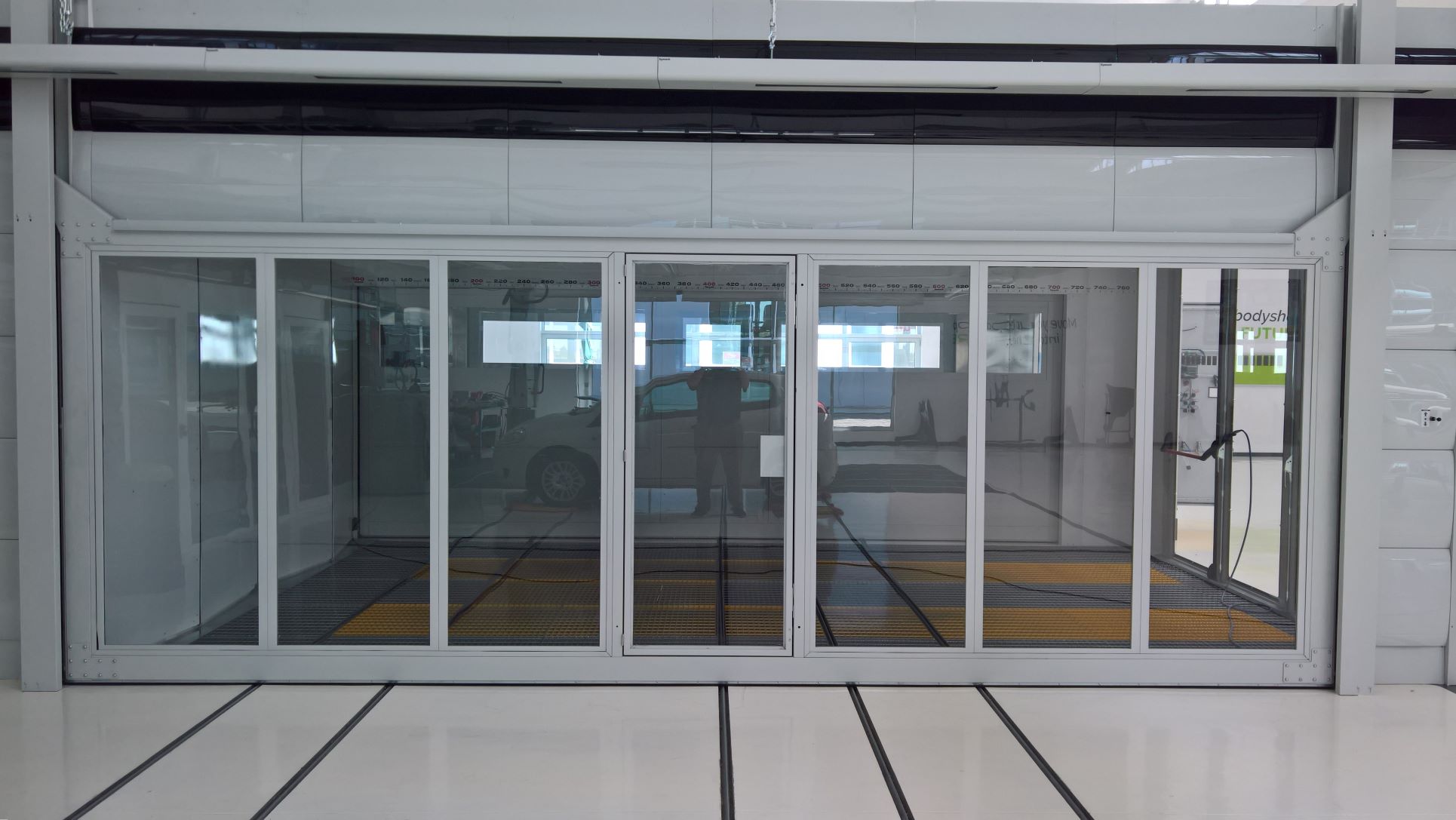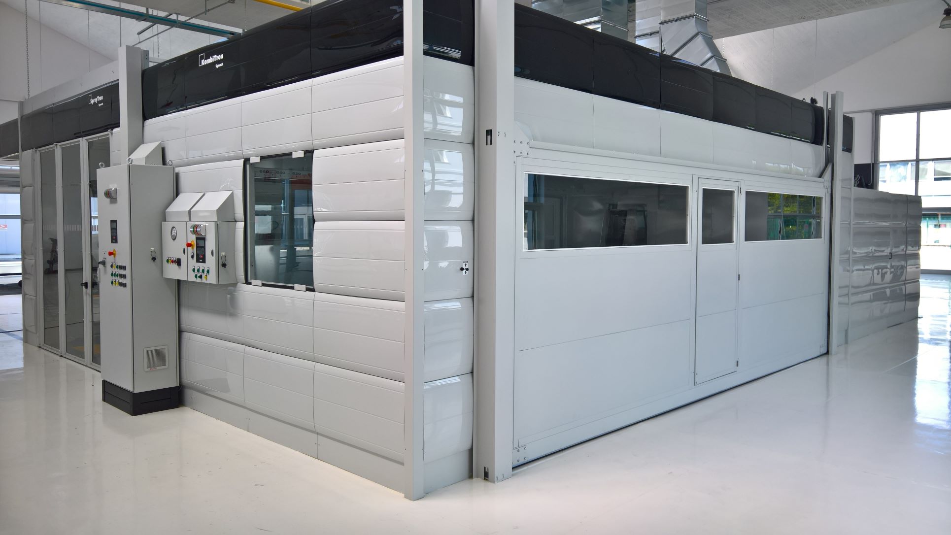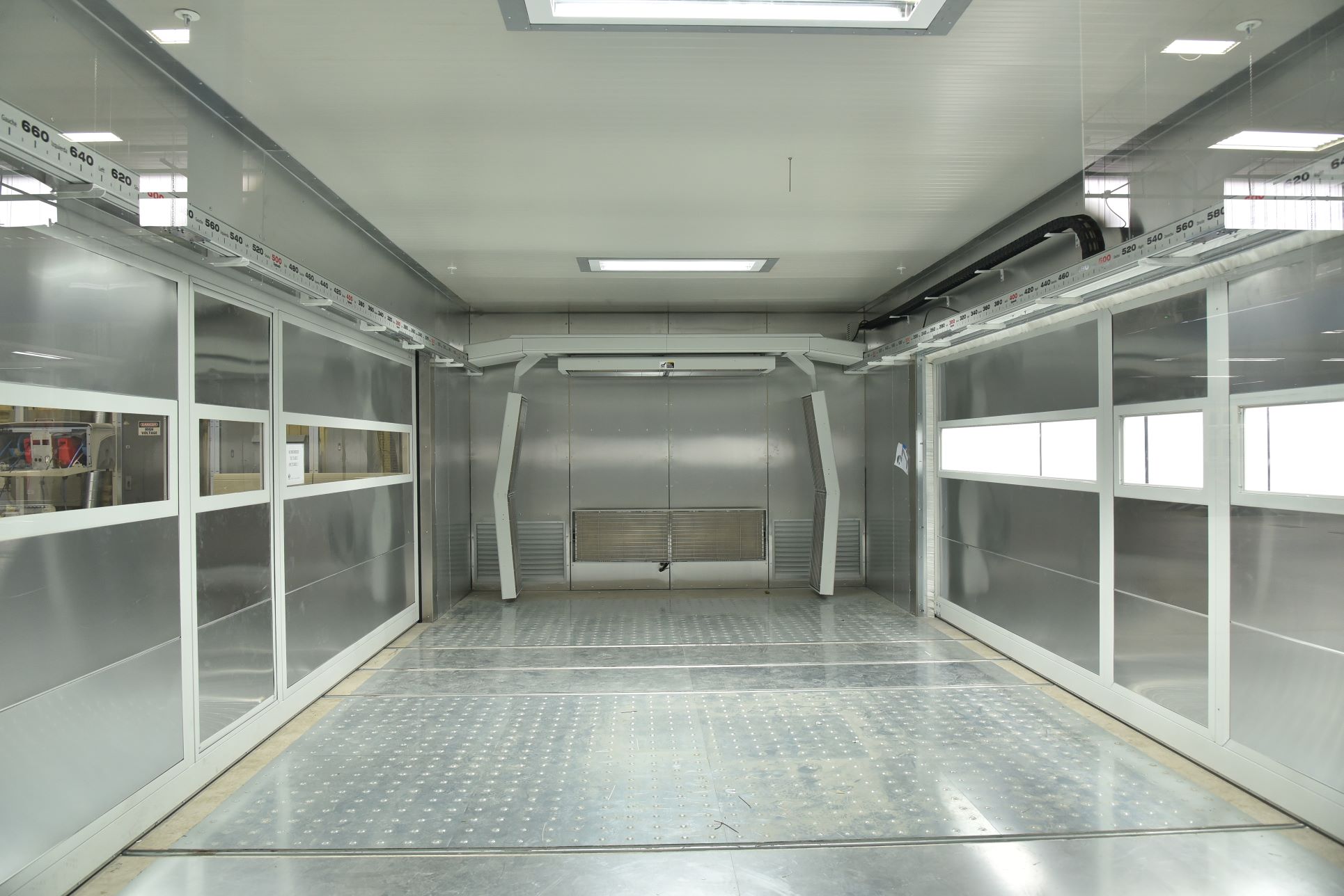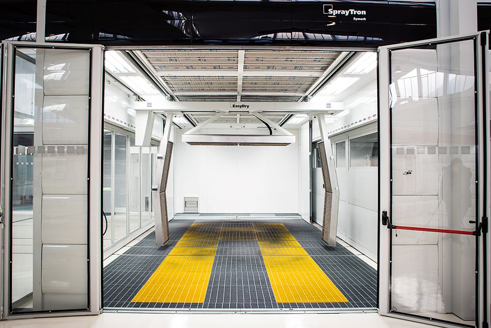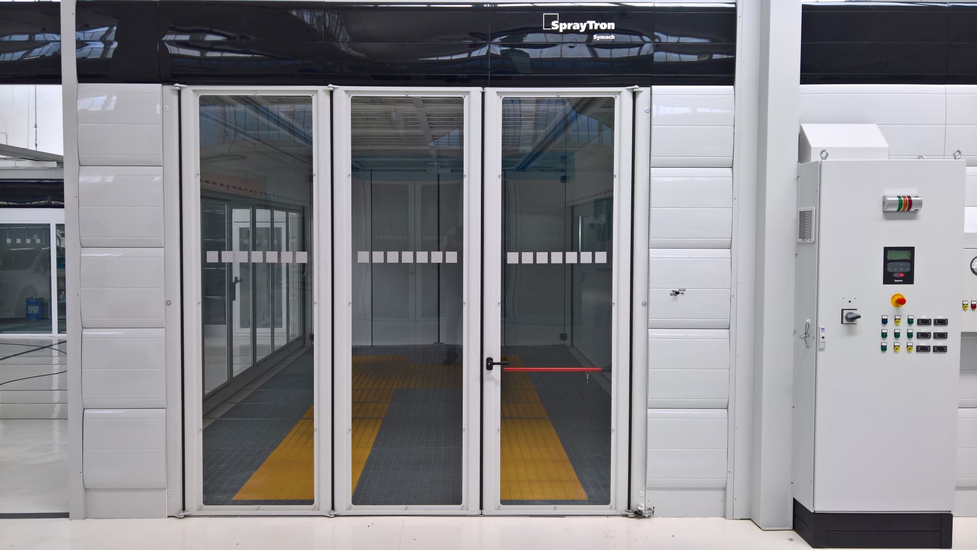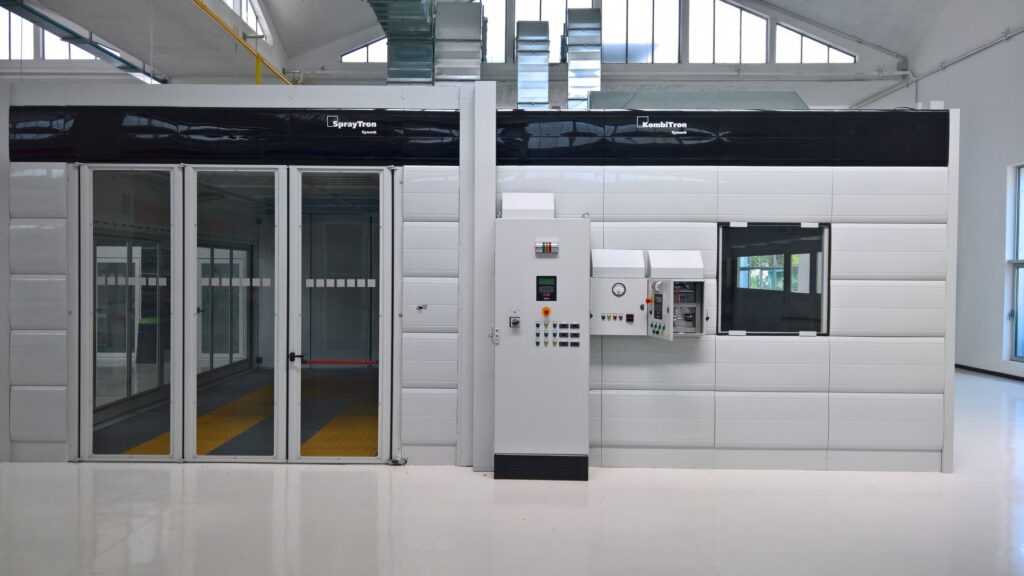 The SprayTron spray booth features a direct-flame burner and an Easydry infrared drying robot.