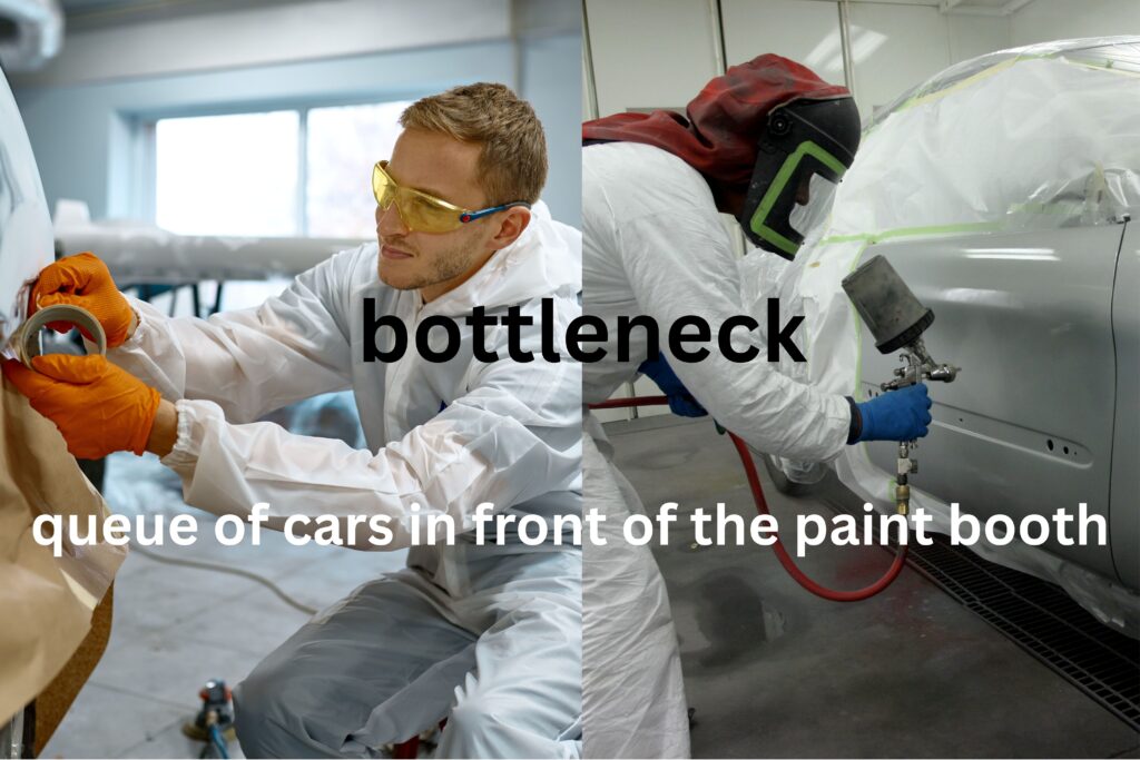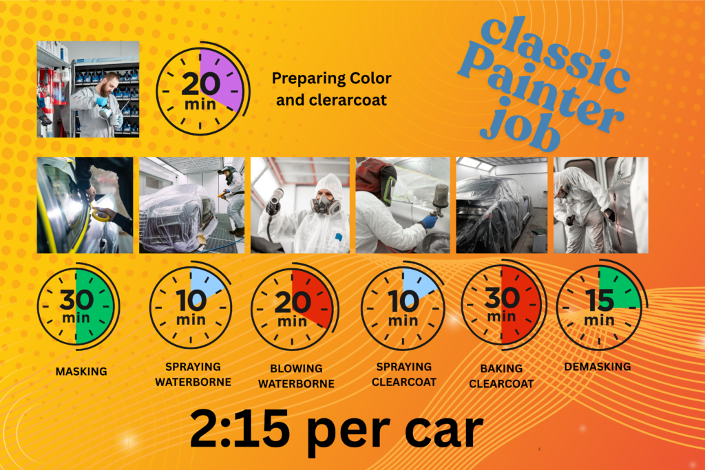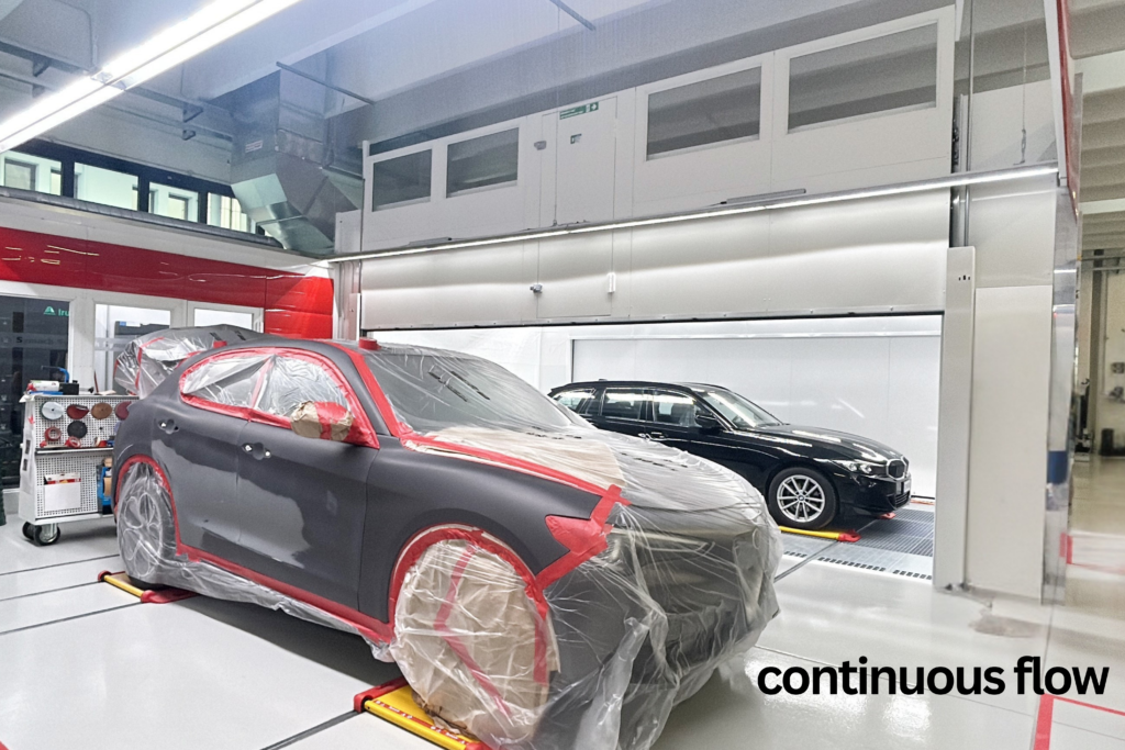 In traditional body shops, curing and drying times force vehicles to stop between phases.